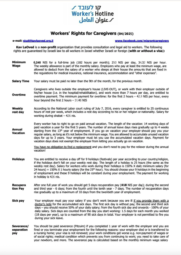 This article breaks down your legal rights in simple language, based on the latest update (April 2025) from Kav LaOved, a non-profit organization that helps workers in Israel. Whether you live with your employer or work in a nursing home or hospital, this guide is for you. Don’t let anyone take advantage of your hard work—you deserve to be treated with dignity and respect.