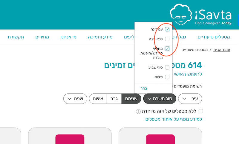 - בחירת מטפלים ״עם לינה״ ו״מחליף לחופשת מולדת״ בתור סוג המשרה - בשל העובדה שהתשלום יותר גבוה עבור החלפות, גם מטפלים המחפשים עבודה באופן קבוע ישמחו לבצע החלפות. לכן כדאי מאד לסנן את רשימת המטפלים לפי סוגי המשרה הנ״ל, כפי שתוכלו לראות בצילום המסך שלפניכם